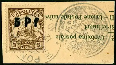 В июле 1910 года у того же острова Понапе неожиданно для островитян появились корабли Восточно-Азиатской крейсерской эскадры ВМФ Германии во главе с флагманским броненосным крейсером «Шарнхорст». За время пребывания на Понапе (2—7 июля) местному населению и экипажам военных кораблей удалось израсходовать все находившиеся там запасы почтовых марок номиналов 5 и 10 пфеннигов. Для покрытия текущего спроса после отплытия эскадры в почтовом отделении острова было принято решение надпечатать 3-пфенниговые марки 5 Pf и продавать их, соответственно, по пять, а также вертикально разрезать номинал 20 пфеннигов и продавать половинки по десять. Было создано 500 провизориев с надпечатками и ещё 500 провизориев-бисектов[11][12][13][14].