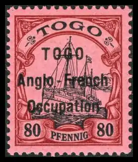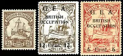 В процессе оккупации германских территорий союзными силами остававшиеся в распоряжении местных почтовых отделений запасы марок серии «Яхта» реквизировались, а деятельность германских колониальных почтовых администраций прекращалась. Однако позже марки запускались в оборот снова, но с надпечатками новых номиналов в британской валюте (пенсах и шиллингах) и статусными надписями. Первые такие выпуски увидели свет уже в 1914 году[24].