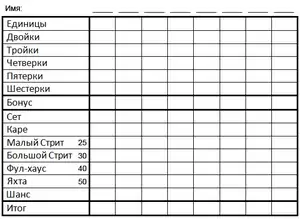 - Яхта (The Yacht): Пять костей, на которых выпали одинаковые значения. Записывается 50 очков.