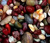 Галька зелёно-красной яшмы с участками серого полупрозрачного халцедона, префектура Аомори, Сичири-Нагахама, Япония