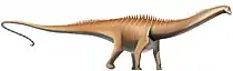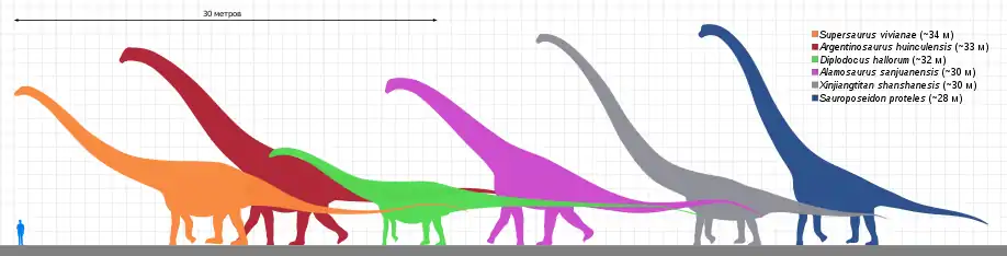 Первые завроподоморфы постепенно перешли с хищничества на всеядность, а позже на растительноядность[29], при этом в определённый момент сменив бипедальную походку на квадропедальную[30][31]. Последние завроподоморфы, не относящиеся к завроподам (ранее выделялись в группу прозавропод), вымерли в ранней юре[7]. Завроподы были квадропедальными растительноядными со столбообразными конечностями и длинными хвостами и шеями. Сочетание наследованных от предков признаков и эволюционных новшеств позволило разным группам завропод поздней юры и мелового периода независимо вырасти до гигантских размеров (хотя известны и карликовые формы[32][33])[34]. Тогда как первые завроподоморфы достигали около 1,5 м в длину, длина крупнейших завропод могла достигать 35—45 м, что делает их самыми длинными когда-либо существовавшими позвоночными[35][36].