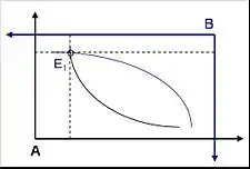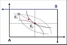 Если начальное распределение ресурсов неэффективно (то есть соответствующая точка не лежит на кривой контракта), то при рациональности обоих экономических субъектов добровольный обмен благами будет проводиться до тех пор, пока полученное распределение не станет Парето-эффективным (рис. 2). Эта точка, от которой невыгодно отклоняться ни одному из субъектов, называется равновесием в экономике обмена. Множество равновесий образует ядро экономики и является подмножеством договорной кривой.