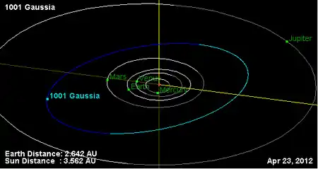 ![]() Орбита астероида (1001) Гауссия (синий), орбиты планет (красный) и Солнце в центре (чёрный). | |