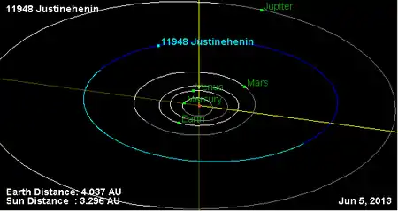 Орбита астероида Жюстинэнен и его положение в Солнечной системе