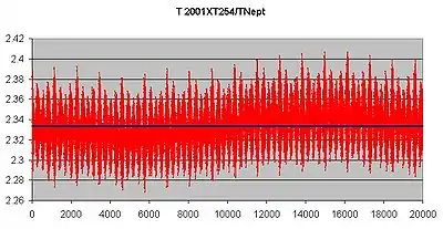 Орбитальный период 2001 XT254 около резонанса 3:7 (2.333) с Нептуном.