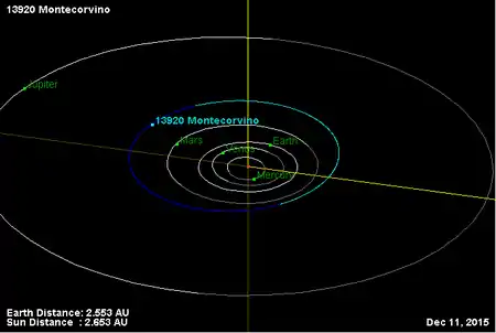 Орбита астероида Монтекорвино и его положение в Солнечной системе