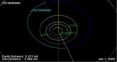 (253) Мати́льда (нем. Mathilde) — астероид главного пояса, который принадлежит к тёмному спектральному классу C. Астероиды этого класса богаты различными углеродными соединениями, которые сильно поглощают свет, давая очень низкое альбедо. Матильда — один из немногих астероидов с крайне медленным вращением вокруг своей оси: она делает один оборот за 17,4 суток. Она была открыта 27 июня 1884 года австрийским астрономом Иоганном Пализой в Венской обсерватории[9] и назван в честь жены французского астронома Мориса Леви, ставшего впоследствии вице-директором Парижской обсерватории. Название было предложено сотрудником Парижской обсерватории В. А. Лебёфом (фр. V. A. Lebeuf), который просчитал орбитальные параметры Матильды[10].