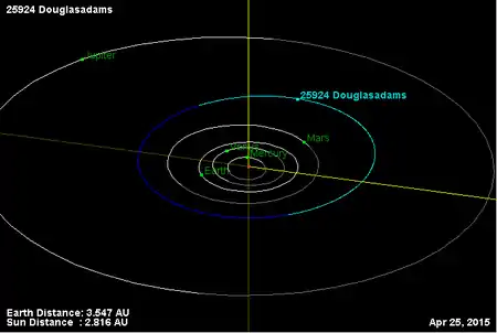 (25924) Дугласадамс (англ. Douglasadams) — типичный астероид главного пояса, который был обнаружен 19 февраля 2001 года в рамках проекта LINEAR в обсерватории Сокорро и назван в честь английского писателя-фантаста Дугласа Адамса, в связи с тем что предварительное название астероида (2001 DA42) содержит в себе год смерти писателя, его инициалы и «ответ на главный вопрос жизни, Вселенной и всего вообще» — 42, как он звучит в романе Адамса «Путеводитель по галактике для путешествующих автостопом»[2][3].