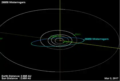 - Орбита астероида Мистерроджерс и его положение в Солнечной системе