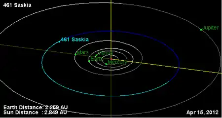 Орбита астероида Саския и его положение в Солнечной системе