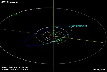 - Орбита астероида Брэдвуд и его положение в Солнечной системе