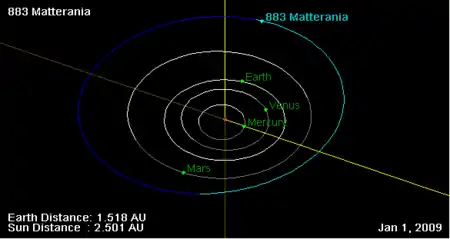 Орбита астероида Маттерания, и его положение в Солнечной системе на 01.01.2009 г. Рисунок NASA JPL Small Body Orbit Viewer applet