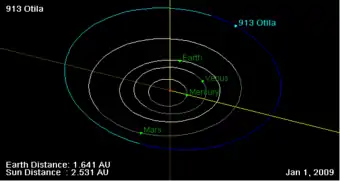 Орбита астероида Отила, и его положение в Солнечной системе на 01.01.2009 г. Рисунок NASA JPL Small Body Orbit Viewer applet