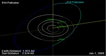 Орбита астероида Пализана, и его положение в Солнечной системе на 01.01.2009 г. Рисунок NASA JPL Small Body Orbit Viewer applet