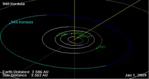 Орбита астероида Кордула, и его положение в Солнечной системе на 01.01.2009 г. Рисунок NASA JPL Small Body Orbit Viewer applet