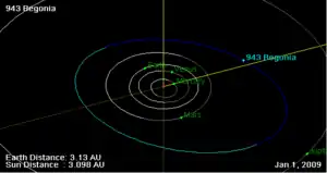 Орбита астероида Бегония, и его положение в Солнечной системе на 01.01.2009 г. Рисунок NASA JPL Small Body Orbit Viewer applet