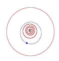 ![]() Орбита астероида (9937) Трицератопс (синим), орбиты планет (красным) и Солнце в центре (чёрным). | |