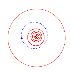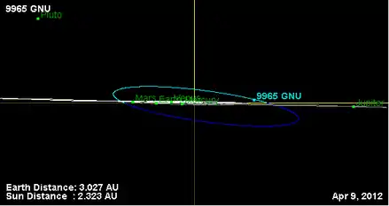 ![]() Орбита астероида (9965) GNU (синим), орбиты планет (красным) и Солнце в центре (чёрным). | |