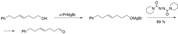 В органическом синтезе 1,1'-(азодикарбонил)дипиперидин применяется преимущественно как окислитель для первичных и вторичных спиртов. В этом случае спирты сначала переводят в алкоголяты под действием н-пропилмагнийбромида или трет-бутоксимагнийбромида (последний полезен, если в субстрат чувствителен к реактивам Гриньяра), а затем обрабатывают 1,2 эквивалента 1,1'-(азодикарбонил)дипиперидина в тетрагидрофуране, что приводит к соответствующим альдегидам и кетонам. Данный подход не затрагивает кратные связи, эпоксиды, амины, сульфиды[1].