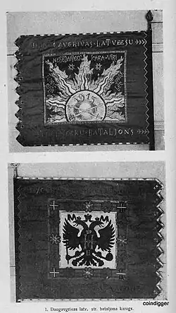 Во время Курземского наступления Германской империи батальоны Даугавгривской крепости 2 и 3 мая 1915 года успешно участвовали в обороне Елгавы. Этот успех стоил жизни 57 защитникам крепости и ранил ещё 155 солдат[1]. 16 августа 1915 года был сформирован 1-й Даугавгривский латышский стрелковый батальон для защиты Риги из добровольцев, ещё не достигших призывного возраста. На флаге батальона было изображено восходящее солнце со скрещенными копьями и девиз «Не бойтесь воинов, солнце серебристое прыгает». Изначально в каждом батальоне было четыре роты и пять команд — разведка, пулеметчики, кавалерийские диверсанты, связь и снабжение. Штат батальона состоял из 26 офицеров, 7 врачей и государственных служащих, 1246 инструкторов и солдат. В нём также было 164 лошади, 4 пулемёта и 47 телег. Каждый батальон сформировал свой боевой оркестр. Во время Кекавских боёв летом 1916 года в составе батальона были созданы ещё две роты.