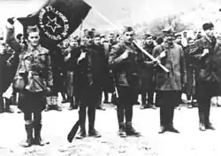 ![]() Иосип Броз Тито проводит смотр 1-й Пролетарской бригады в городе Босански-Петровац, 7 ноября 1942 года. Слева направо: Иван Рибар, Коча Попович, Филип Кляич, Иво Лола Рибар, Тито, Данило Лекич и Миялко Тодорович. | |