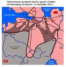 В то же время 20-я моторизированная дивизия захватила Тосно и 30 августа вышла к Неве в районе Ивановского, а части 18-й моторизированной дивизии взяли 29 августа Кириши. Отрезанные от основных сил, остатки 48-й армии были вынуждены отступить к реке Тосна и станции Мга. Ожесточённые бои за Мгу продолжались несколько дней, станция несколько раз переходила из рук в руки. 31 августа части 20-й моторизированной дивизии сумели окончательно захватить Мгу и тем самым перерезали Кировскую железную дорогу — последнюю магистраль связывавшую Ленинград с остальной страной. Более того, 7 сентября 20-я моторизированная дивизия при поддержке части сил 12-й танковой дивизии захватила Синявино, а 8 сентября — Шлиссельбург. Этот день считается днём начала блокады Ленинграда[4].