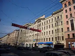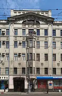 - № 32, — на этом месте стоял доходный дом Е. И. Курникова (1904, архитектор — Э.-Р. Нирнзее)[8]. В доме жил фотожурналист Иван Шагин[33]. Дом был сломан в 1997 году, в 1999 году на этом месте было построено новое здание. Декор современного фасада в общих чертах воспроизводит утраченный.