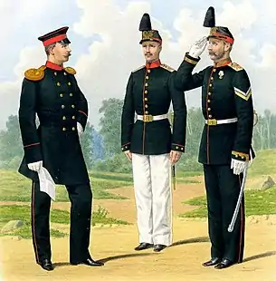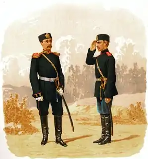 - Илл. 11. Гренадерская и Полевая конная артиллерия. Обер-Офицер 1-й Гренадерской Артиллерийской Бригады ( в парадной форме, вне строя ) и Рядовой 2-й Конно-Артиллерийской Батареи ( в обыкновенной форме, вне строя ) ( прик. по воен. вед. 1881 г. № 313 ) // Иллюстрированное описание перемен в обмундировании и снаряжении войск Императорской Российской армии за 1881–1900 гг.: в 3 т.: в 21 вып.: 187 рис. / Сост. в Техн. ком. Гл. интендантского упр. — СПб.: Картографическое заведение А.Ильина, 1881–1900.
