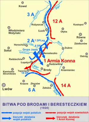 2 июля армия Будённого заняла Ровно[4] и к началу августа подошла к Бродам. Здесь 1-я кавдивизия совместно с кавалерийским подразделением под командованием генерала Казимежа Савицкого вновь попыталась остановить 1-ю Конную (см. Битва под Бродами и Берестечком), но из-за ухудшения ситуации на северном фланге ей снова пришлось отступить[5].
