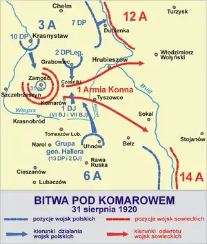 - 14-я дивизия, прочно обеспечив правый фланг армии со стороны Грабовца, с боем отходила на линию Подгорцы — Волковые. Передовые части левофланговой 6-й дивизии, отходившие южнее, отбросили польскую пехоту с переправ через Хучву у Конопне и Вороновицы и установили связь с 44-й стрелковой дивизией в Тышовце. Арьергард Конармии — 11-я дивизия в бою с подошедшим к Хорышову-Русскому противником захватила около двухсот пленных и заняла рубеж Заборцы — Гдешин — Хостине. Начдиву Морозову было приказано вечером перейти в наступление и отбросить неприятеля на запад, а утром следующего дня переправиться через Хучву в Вербковице.