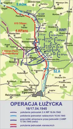 Бригада находилась в составе 1-го Дрезденского танкового корпуса, в составе 2-й армии Войска Польского. Наиболее ожесточённые бои вела в районе коммуны Хорка (Веркирх) на реке Вайсер-Шёпс, а также держала оборону в местечках Эдерниц и Вильгельминенталь. 22 апреля 1945 года достигла Гросрёрсдорфа и Вахау, недалеко от Дрездена, затем была переброшена в район Баутцена и Кёнигсварта. Преследовала во время Пражской операции противника вплоть до Судетов, закончила боевой путь в Мельнике. После окончания войны вернулась в Калиш и Щипёрно.