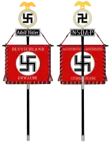 24 июня 1945 года в Москве на Красной площади состоялся Парад Победы. Его завершала колонна солдат, нёсших опущенные знамёна и штандарты частей вермахта и войск СС. Эти знамёна были брошены на специальный помост у подножия Мавзолея Ленина. Правофланговый колонны старший сержант Ф. А. Легкошкур первым швырнул древко штандарта дивизии СС «Адольф Гитлер»[121].