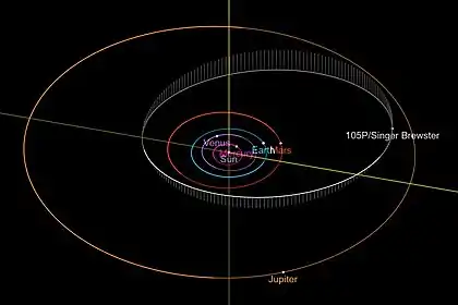 Комета Сингер Брюстера (105P/Singer Brewster) — короткопериодическая комета из семейства Юпитера, которая была обнаружена 3 марта 1986 года американским астрономом Stephen Singer-Brewster в Паломарской обсерватории с помощью 0,46-метрового телескопа системы Шмидта[4]. Она была описана как диффузный объект 15,0 m звёздной величины с небольшой конденсацией в центре. Комета обладает довольно длинным периодом обращения вокруг Солнца — чуть менее 6,47 года.