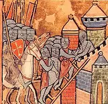 Штурм Антиохии. Крестоносцы поднимаются в башню по лестнице, спущенной предателем Фирузом
