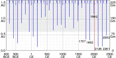 Однако теперь уже точно известна дата подхода кометы к Земле на минимальное расстояние (0,153 а. е.) — 5 августа 2126 года. В тот день она достигнет магнитуды 0,7m. Также в допустимых пределах (0,147 а. е.) остаётся расстояние сближения 24 августа 2261 года[9]. По настоящему тесные сближения кометы с Землёй ожидаются лишь в 3044 году (0,011 а. е.)[16] и 15 сентября 4479 года (0,05 а. е.), но даже тогда вероятность столкновения мала. Вероятность столкновения в 4479 году оценивается всего в 0,0001 %, тогда как аналогичная вероятность после 4479 года составляет всего 2⋅10-6 % на каждый оборот вплоть до 12 000 года н. э.[7]