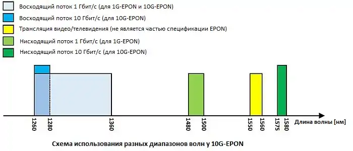 В нисходящем направлении для трансляции 1 Гбит/с и 10 Гбит/с используются волны различной длины: передача 1 Гбит/с производится в диапазоне 1480—1500 нм, а передача 10 Гбит/с - в диапазоне 1575—1580 нм.