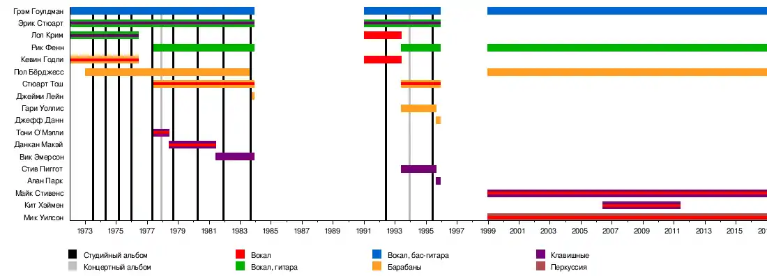 Эрик Стюарт Лол Крим Кевин Годли Стюарт Тош Тони О’Мэлли Данкан Макэй Вик Эмерсон Джейми Лейн Стив Пиггот Гари Уоллис Джефф Данн Алан Парк Кит Хэймен |