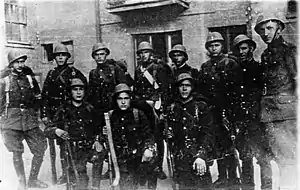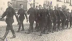 ![]() Украинские полицейские из 115-го батальона шуцманшафта маршируют по улицам Киева в 1942 году | |