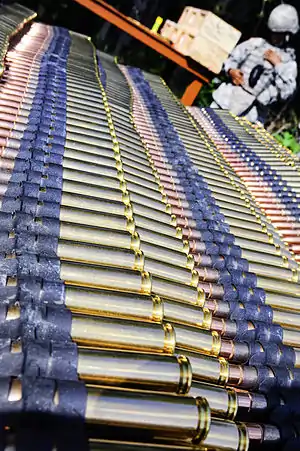 Комбинированная лента .50 из обычных и трассирующих патронов, загруженная в Браунинг М2 на учениях США, Австралии и Канады в Шоулуотер-Бей, Квинсленд. Патроны с красным наконечником — трассирующие.