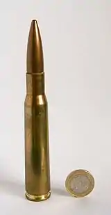 Слева — патрон .50 BMG (для Browning Machine Gun, пулемётный патрон Браунинга 50-го калибра), 12,7x99 мм, обр. 1920 г. в разрезе (все размеры в миллиметрах), справа — патрон .50 BMG в сравнении с монетой в 1 евро. | ||