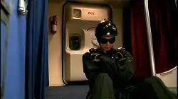 ![]() Мэнди (Миа Киршнер), внештатный террорист, за несколько секунд до взрыва 747. Эта сцена, показанная два месяца спустя после терактов 11 сентября, отложила показ пилота «24 часов». Эта сцена была также смонтирована для чувствительного содержимого. | |||||