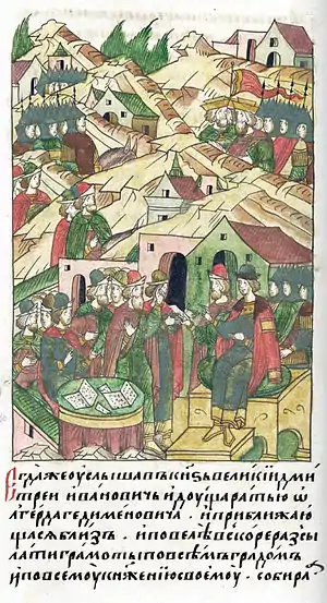 Великий князь Московский Дмитрий Иванович рассылает грамоты по русским городам для объединения сил против войск Ольгерда 1368 г. Миниатюра из Лицевого свода