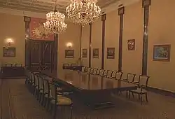 За фасадным корпусом находились помещения администрации президента. Средний корпус рабочей части соединялся с Мраморным залом. Изначально его убранство включало композицию из десяти статуй, представляющих рабоче-крестьянское движение. По легенде, во время установки выяснилось, что памятник, изображавший военного, целился пистолетом в трибуны пленума ЦК, поэтому пришлось изготовить новую скульптуру в кратчайшие сроки[15].