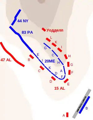 Алабамцы несколько раз атаковали левое крыло Чемберлена и в итоге отбросили его назад, вверх по склону. Адъютант алабамского полка, капитан Де Бирни Уодделл попросил разрешения у Оатса взять 40-50 человек и подняться ещё выше по склону, чтобы выйти во фланг федералам. Оатс утвердил это предложение, и Уодделл сумел выйти почти на вершину хребта, откуда его люди открыли огонь вниз, в тыл 20-му Мэнскому, 83-му Пенсильванскому и 44-му Нью-Йоркскому.[6].
