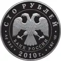 100 рублёвая монета 2009 г. из серебра 925 пробы. (реверс)