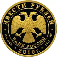 200 рублёвая монета 2009 г. из золота 999 пробы. (аверс)