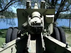 152-мм гаубицы-пушки обр. 1937 г. (МЛ-20) в Петропавловской крепости, Санкт-Петербург. Вид сзади справа. Обратите внимание на модернизированный колёсный ход. Эти орудия использовались для традиционного полуденного выстрела.