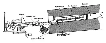 Заряжание орудия — картузное. Каждое орудие устанавливалось в индивидуальную люльку. Орудия имели углы вертикального наведения от −5° до +45°. Заряжание осуществлялось при фиксированном угле возвышения +5°. Все приводы были электрогидравлическими. Для вертикального наведения каждый ствол имел привод от собственного электродвигателя мощностью 60 л. с.[14] В состав орудийной сборки входили затвор, запальный механизм, эжектор и хомут. Поршневой затвор — системы Велина, качающийся, с открыванием вниз. Затвор оснащался пневматическим приводом, подшипниковой подвеской и обтюратором системы Банжа. В него также входил стреляющий механизм, в который вставлялся запал в медной гильзе. Запал представлял собой длинную трубку с дымным порохом, которая вставлялась в затвор в соответствующее гнездо перед выстрелом. Штатно стреляющий механизм срабатывал дистанционно от электрической системы спуска, но имелся также и резервный ручной ударный механизм. Затвор оснащался инерционными предохранителями от двойного заряжания, блокирующими открывание при нахождении снарядов и заряда в каморе. Поршень содержал 15 секторов — три гладких и 12 нарезных, четырёх диаметров. Сектора располагались тремя группами, каждая из которых охватывала треть окружности. Сначала шёл гладкий сектор минимального диаметра, потом шли нарезные с возрастанием диаметра от первого к третьему. Для открывания затвора достаточно было повернуть поршень на 24°[11]. После выстрела ствол продувался воздухом под давлением в 175 psi, поступавшим из эжекторной системы[15].