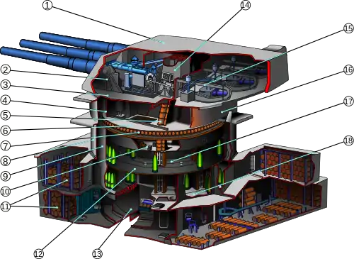 Боевое отделение, в просторечии «башня», представляет собой бронированную конструкцию, вращающуюся над барбетом. В боевом отделении находятся три отделения орудий в индивидуальных люльках, два наблюдательных и один дальномерный пост. Все эти отсеки отделены друг от друга пламенепроницаемыми переборками. Орудийные отделения продолжались вниз (при подъёме ствола казённая часть орудия опускалась ниже уровня пола боевого отделения) на следующий уровень, который назывался «машинной» палубой (англ. machinery flat). Здесь находились механизмы горизонтальной наводки[15]. Электрогидравлический привод мощностью 300 л. с.[17] обеспечивал скорость вращения башни на 4° в секунду[12]. Подбашенное отделение опиралось на роликовый погон и к нему же крепилась центральная колонна подачной трубы. Роликовый погон представлял собой своего рода гигантский подшипник с 72 коническими роликами[15].