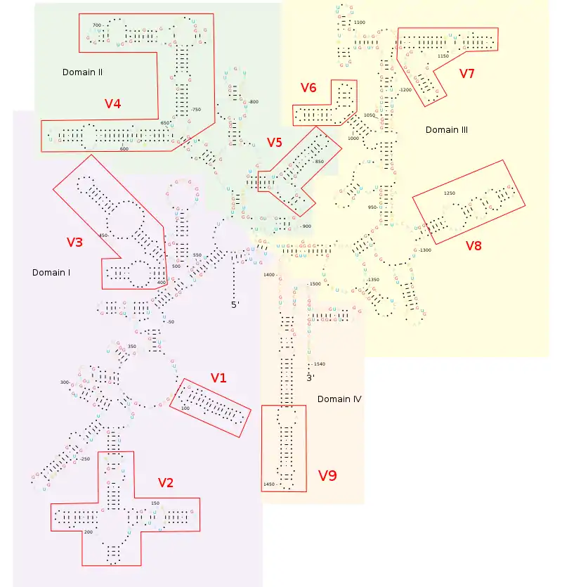 Ген 16S рРНК содержит девять гипервариабельных участков, обозначаемых V1 — V9. Каждый участок имеет длину от 30 до 100 пар оснований. Эти участки вовлечены в образование вторичной структуры малой субъединицы рибосомы. Между гипервариабельными областями ген 16S рРНК содержит высоко консервативные последовательности. Степень консервативности гипервариабельных участков не одинакова — показано, что последовательности более консервативных участков сходны у организмов на уровне таксонов высоких рангов, а менее консервативные — на уровне низких таксономических рангов таких, как роды и виды[8][9].